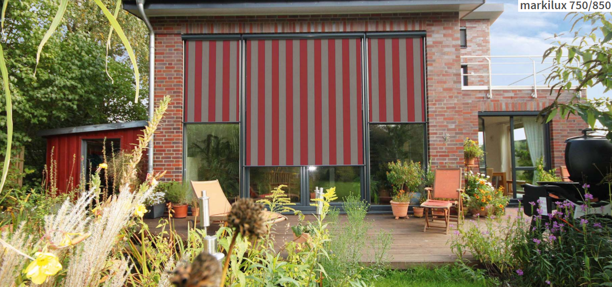 markilux 750/850 Vertikal-Kassettenmarkise Der Sonnen- und Blendschutz wird bei der Vertikalmarkise markilux 750 (mit eckiger Tuchkassette) bzw. markilux 850 (mit runder Tuchkassette) durch Edelstahlstangen geführt. Die Senkrechtmarkise ist eine elegante Beschattung, die perfekt vor Sonne und ungewollte Hitze schützt.