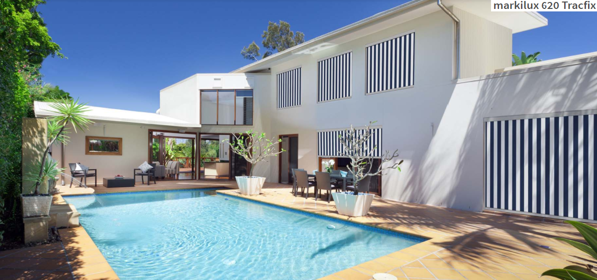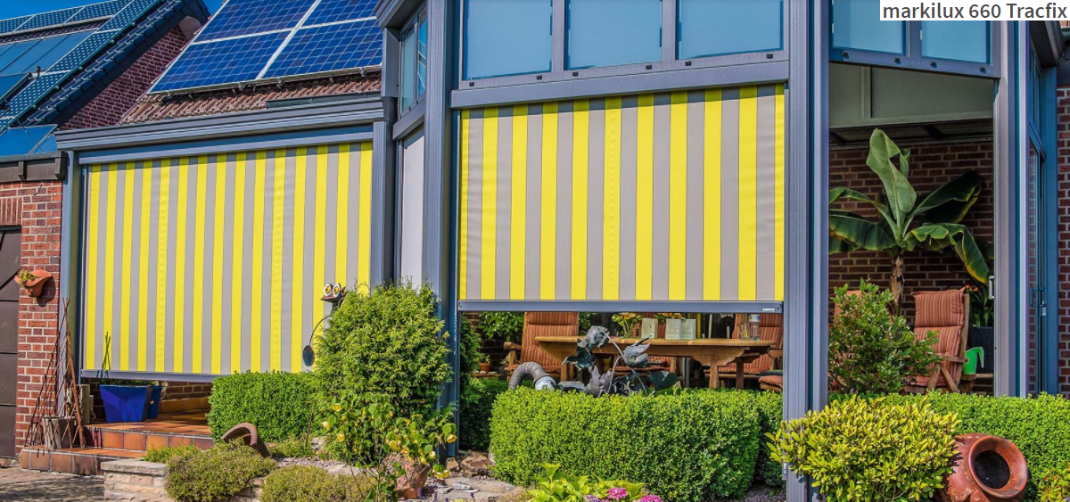 markilux 660 Vertikal-Kassettenmarkise Mit der markilux 660 tracfix schlägt man mindestens zwei Fliegen mit einer Klappe: Sie schützt vor Sonne und unliebsamen Blicken, sie hält durch das tracfix-System, das seitlich perfekt abschließt, dem Wind stand – und zusammen mit dem Fliegengitter die Insekten draußen. Und: Das Gegenzugprinzip sorgt durch Variogurte für besonders hohe Tuchspannung.